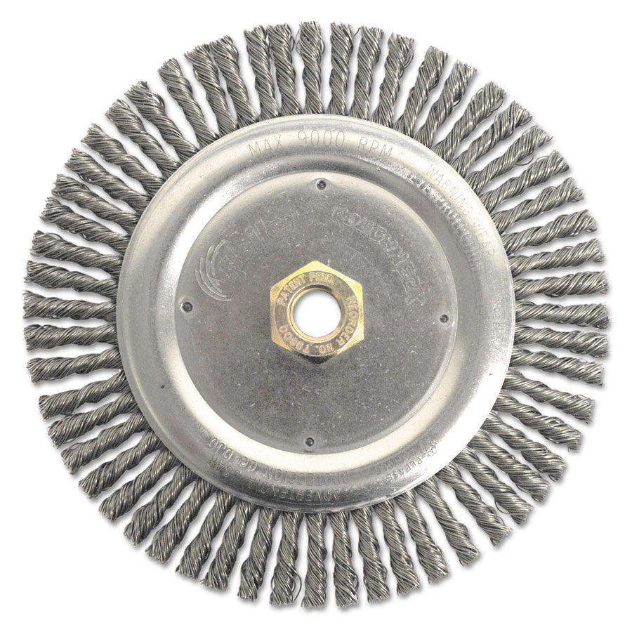 Carbon steel wire wheel designed to handle the most demanding multi-pass welding applications. The one-piece dual hex-nut eliminates interference issues and simplifies periodic flipping of the wheel for maximum cutting action.
