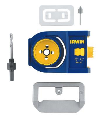 - Includes = Kit includes: Double sided jig; (2) Carbon hole saws; 3/8 in Mandrel; Bolt plate template; Custom router bit; Hinge plate template